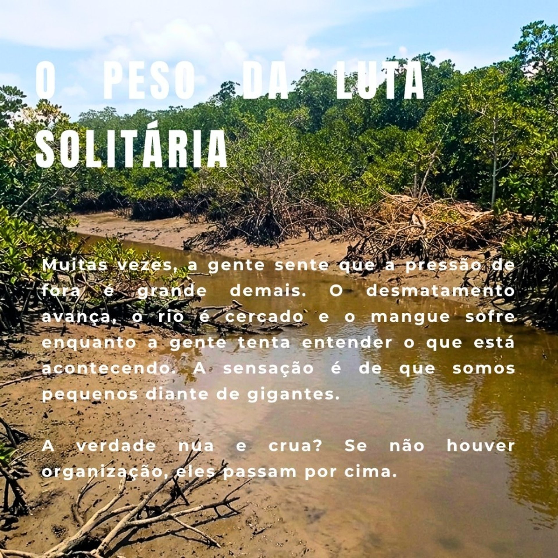 Lutar sozinho é o caminho mais rápido para a exaustão. Nas comunidades pesqueiras, quilombolas e tradicionais, sentimos o peso do desmatamento e do cercamento dos nossos rios e mangues. Mas a nossa maior tecnologia de sobrevivência não se compra em lojas: é a nossa capacidade de nos articularmos. Território livre é território que se comunica e se protege.